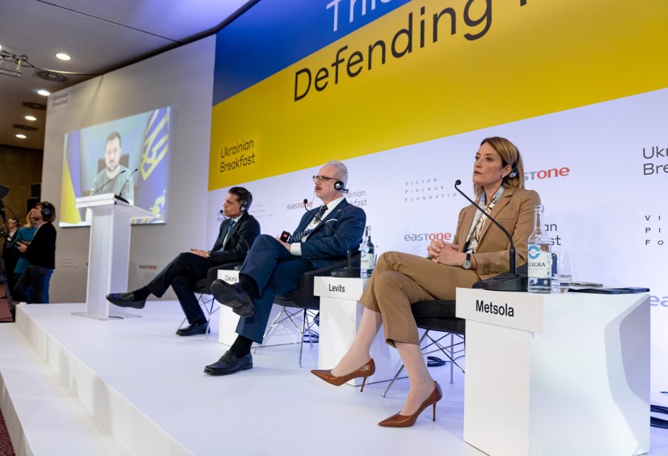 Fareed Zakaria, host of Fareed Zakaria GPS on CNN, Egils Levits, President of Latvia, and Roberta Metsola, President of the European Parliament