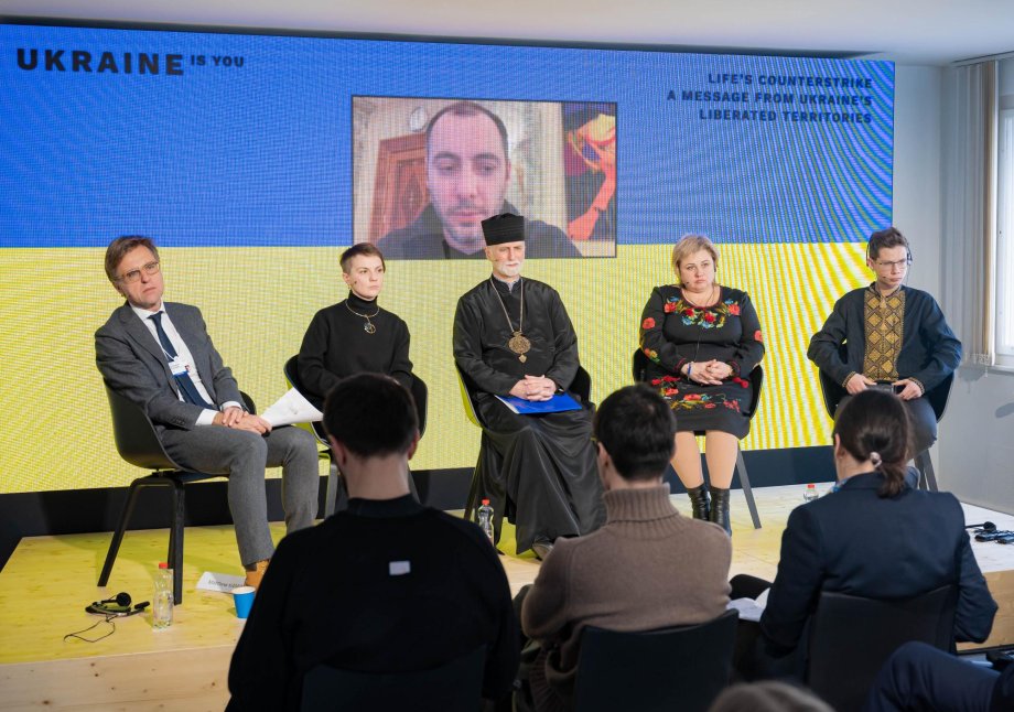 Matthew Kaminski, Editor-in-Chief, Politico; Nataliya Gumeniuk, Founder, Public Interest Journalism Lab; Co-Founder & Chair, NGO Hromadske; Borys Gudziak, Metropolitan Archbishop of Philadelphia for Ukrainian Catholics in the United States and President, Ukrainian Catholic University; Olga Tsilynko, volunteer from Kherson and her son, Nazar Lysenko; Oleksandr Kubrakov, Vice Prime Minister for the Reconstruction of Ukraine (online)