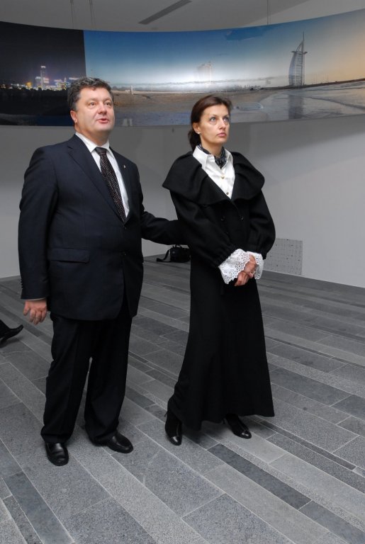 Peter Poroshenko with a spouse. Background: \"Begining of the End: Shanghai and Dubai\"